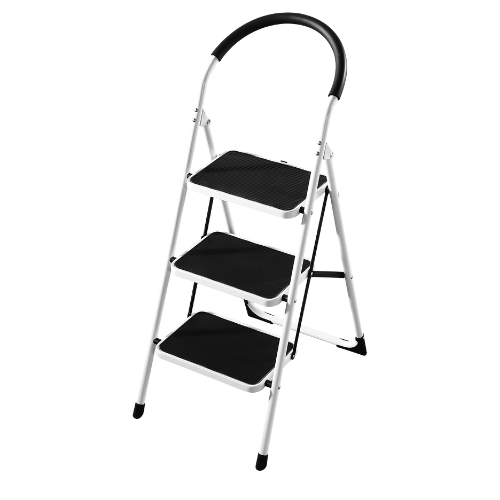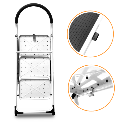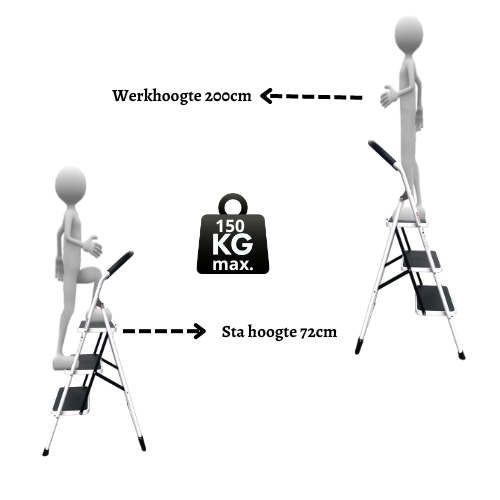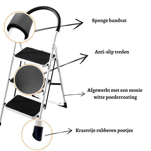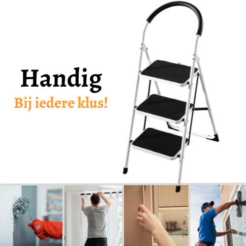 Ook is deze huishoudtrap handig voor het ramenwassen, gordijnen ophangen, etc. Noem het maar op. Deze keukentrap is erg stabiel, ontzettend stevig en gemaakt van staal. De treden en voetjes zijn voorzien van een anti-slip oppervlakte, zodat je veilig kunt werken. Het platform vergrendeld zich automatisch zodra je deze uitklapt. Ook beschikt de trap over sponge handgrepen voor de ideale handgrip.