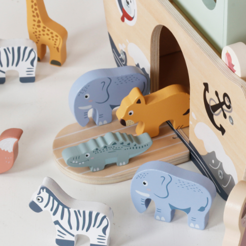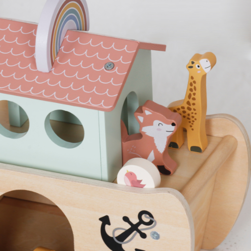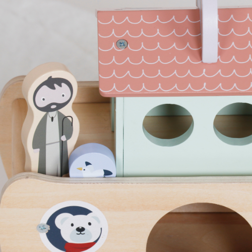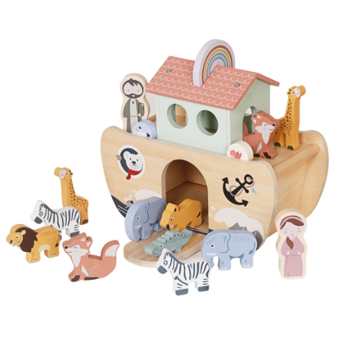 De ark is gemaakt van hoogwaardig hout en bevat verschillende kleurrijke dierenparen, samen met Noach en zijn vrouw. Kinderen kunnen de dieren sorteren, instappen laten en hun eigen avonturen bedenken. Hierdoor ontwikkelen ze fijne motoriek, creativiteit en fantasie.